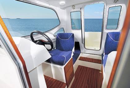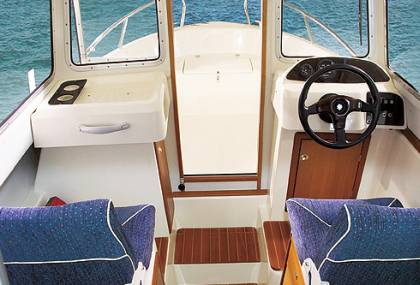 Многофункциональная модель с каютой в средней части предназначается для поездок с ранней весны до поздней осени. Просторная средняя каюта имеет две двери, ведущие в кормовой и носовой кокпиты. Сдвижные верхние люки для большего освещения и вентиляции. Место для дополнительного мотора для спокойной рыбалки. Самоотливные кокпиты.