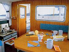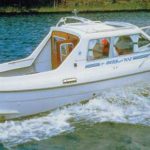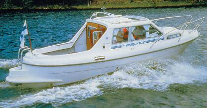 Каютный круизный катер, идеальный для небольшой семьи. Полуглиссирующая модель. Основные черты катера – большой кокпит и просторная каюта. В кокпите есть U-образный диван на шестерых, стол, расположенный над машинным отделением. Био-туалет в кормовом отделении. Большой тент над кокпитом. Слева в каюте расположен диван, обеденный стол, который опускается и конвертируется в кровать для ребенка. Кухонное отделение: раковина и плита/обогреватель.