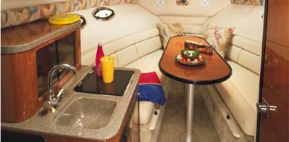 Возможно, нет места лучше дома, но в некоторых местах может быть действительно лучше. Куда бы Вы не кинули взор, Вы найдете роскошную домашнюю обстановку, как по Вашему заказу. Дизайнерская отделка. Мерцание полировки, отделка деревом вишни. Кухонная стойка с раковиной, плитой и холодильником. Шикарный ковер под ногами. Впечатляющая подсветка. Катер создан для того, чтобы бесконечно наслаждаться!