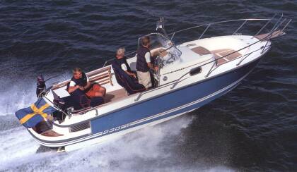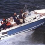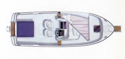В стандартной комплектации: интерьер с отделкой полированным тиком, туалет, флагшток, держатели удочек, ручная и автоматическая донные помпы, компас, стол в кокпите, крюк для лыжника, ковер в каюте.