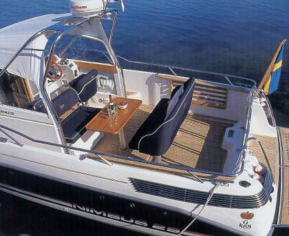 Самоотливной кокпит с нескользящим тиковым настилом. Релинги из нержавеющей стали и носовая площадка из тика на бушприте. Якорный ящик в носовой части корабля. Сиденья на крыше каюты с релингами и подушками. Два больших ящика для хранения на кормовой части. Широкие проходы в носовой части. Релинги из нержавеющей стали, огораживающие борта катера. Мягкие сиденья на месте рулевого. Шесть нержавеющих швартовых уток. Ручная донная помпа. Встроенная плавательная платформа с якорным ящиком. Нержавеющая вентиляционная решетка на машинном отделении. Держатели удочек из тика, место и крюк для водных лыж. Широкие проходы с релингами из нержавеющей стали, ведущие на плавательную платформу. Держатели кранцев из нержавеющей стали. Эмблемы «Nimbus».