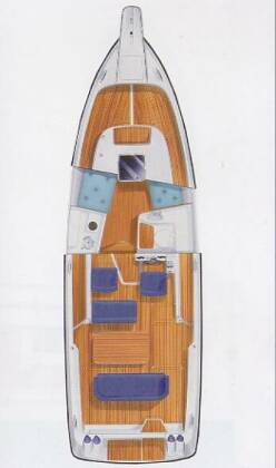 Закрывающаяся деревянная дверь с решеткой для вентиляции и люк из стеклопластика. Двухместный U-образный диван и небольшой обеденный столик, который можно перенести на кормовую площадку. Отделка из лакированного тика. Отсек камбуза. Шкаф для одежды. Пол из ламинированного тика. Галогенное освещение. Открывающиеся иллюминаторы. Занавески. Световой люк. Зеркало.