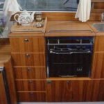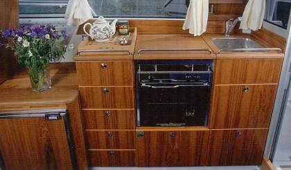 Отделка тиком; газовая плита с двумя горелками и духовкой; мойка из нержавеющей стали, смеситель, разделочный столик; холодильник с морозильной камерой, 65 л; шкафчики для посуды и столовых приборов, чашек, стаканов; корзина для мусора
