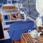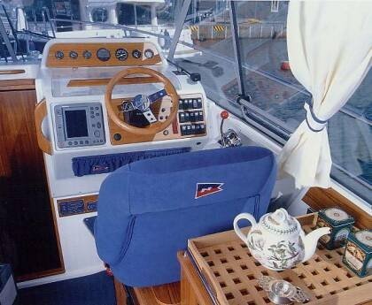 Штурвал из полированного тика; гидравлический привод руля; дистанционное управление двигателем; магнитный компас с подсветкой; приборная панель, полированный тик; столик для карты с держателем; прибора контроля за двигателем; датчики уровня топлива и воды