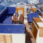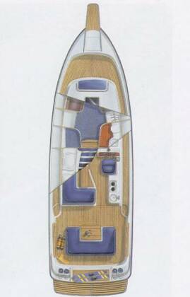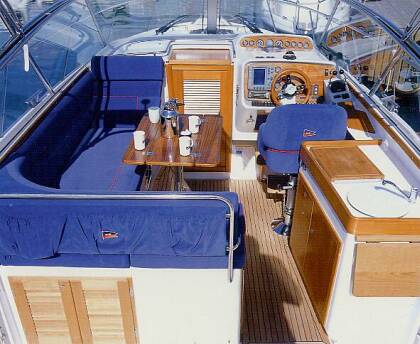L-образный диван, столик из тика, камбуз и сиденье рулевого. Хард-топ (крытый жесткий верх со сдвижным люком) над кокпитом (Опция в дополнительной комплектации). Сдвижная дверь и переборка на кормовую палубу. Тент над кокпитом, складной, с дугами и фитингами из нержавеющей стали. Закаленное изогнутое ветровое стекло и обрамлением из нержавеющей стали. Сиденья для 5 пассажиров вокруг обеденного столика, продольное сиденье служит лежаком для загара.