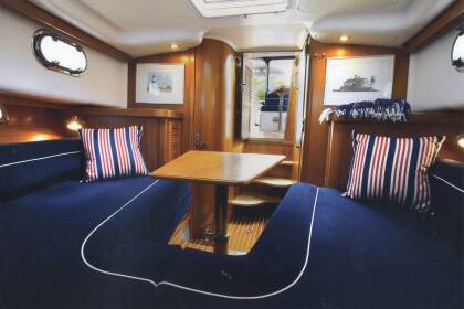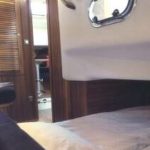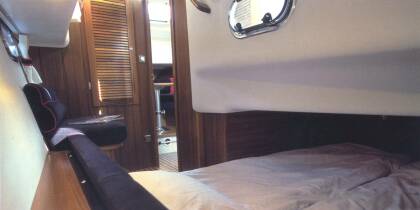 Тиковые ступеньки, ведущие в носовой салон, включающий в себя 2 отдельные кушетки справа, вход в боковую каюту с двуспальной кроватью, туалетное отделение по правому борту. Комфортабельное размещение 4х человек, при использовании запасной кушетки из кокпита.