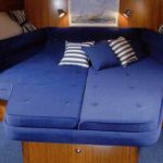 Передняя каюта: Просторная двуспальная кровать. Три больших ящика для хранения под ней. Шкафы для одежды по правому и левому бортам. Открывающиеся иллюминаторы. Открывающийся верхний люк со шторкой. Зеркало в деревянной раме. Элегантная обивка.