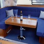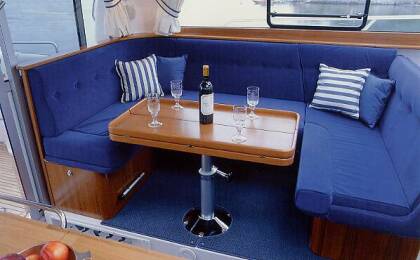 Салон-вестибюль: U-образный диван для 6 человек, подушки. Сдвижная дверь на кормовой кокпит. Открываемые окна по левому и правому бортам. Большое отделение для навигационных карт. Тиковый пол между столовой и камбузом. Ковер на полу. Электрическая розетка.