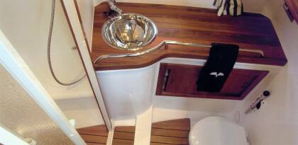 Туалетная комната: Открывающийся иллюминатор. Душ, работающий от электрического насоса. Шторка душевой кабины. Зеркало. Туалет.